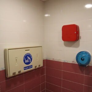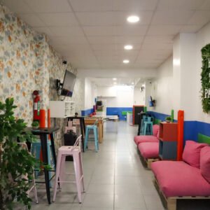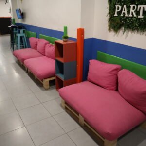 – 3 Sofás de palets – 3 Mesas altas y 8 taburetes – Percheros – Paragüeros – 2 cubos se basura de 50 litros – Mesas grandes plegables con sillas – Mesas infantiles con sillas infantiles – Baño adaptado con cambiador de bebé y secador (equipado con papel higiénico, toallitas de mano de papel y jabón) – Baño infantil con adaptador WC para niños (equipado con papel higiénico, toallitas de mano de papel y jabón)