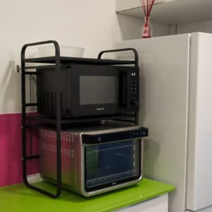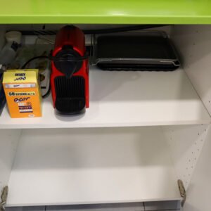 – Horno, freidora de aire, microondas, sanwichera-tostador, perritera, cafetera Nespresso de cápsulas… – Equipado con cuchillos, tijeras, cortapizzas, pinzas, tabla de cortar, papel de horno, jarritas de agua… – Frigorífico con congelador